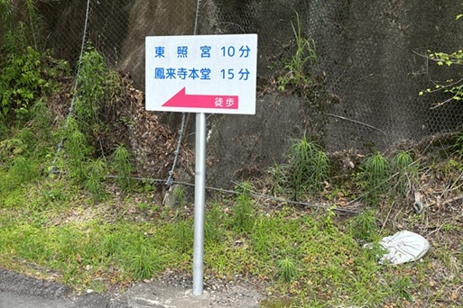 ▲案内表示には「東照宮まで徒歩10分」「鳳来寺本堂まで徒歩15分」とあります。緩やかな山道で歩きやすいのが嬉しいポイント。