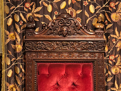 赤いベルベットの座面と木彫りの重厚なデザインが印象的で、 まるで異国の神殿にいるような神秘的な空気に包まれています。