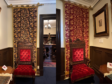 椅子の後ろにあるタペストリーの色が男性は黒、女性は赤色なのですぐに分かります。