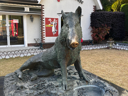 庭に置かれた「カリドンの猪」(愛称:ボルチェリーノ)は、 ギリシャ神話に登場する猪をモチーフにしたブロンズ像で、 鼻をなでると幸せが訪れると伝えられる開運のパワースポット。