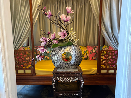 タペストリーの柄は、豊穣を象徴するザクロのようにも見えます。
