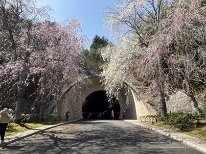 その先に広がるピンクと白のしだれ桜が、トンネルのカーブと調和して、まるで一枚の絵画のような美しさを生み出しています。