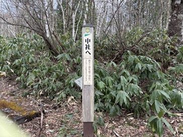 奥社入口バス停のあたりまで戻り、反対側の歩道へ渡ると、 「中社へ」の道標が現れます。