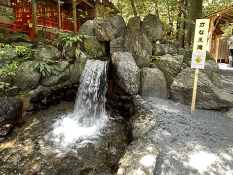 椿岸神社のすぐ横にある「かなえ滝」は、静かに流れる清水が願いを叶えてくれると伝えられるパワースポット。